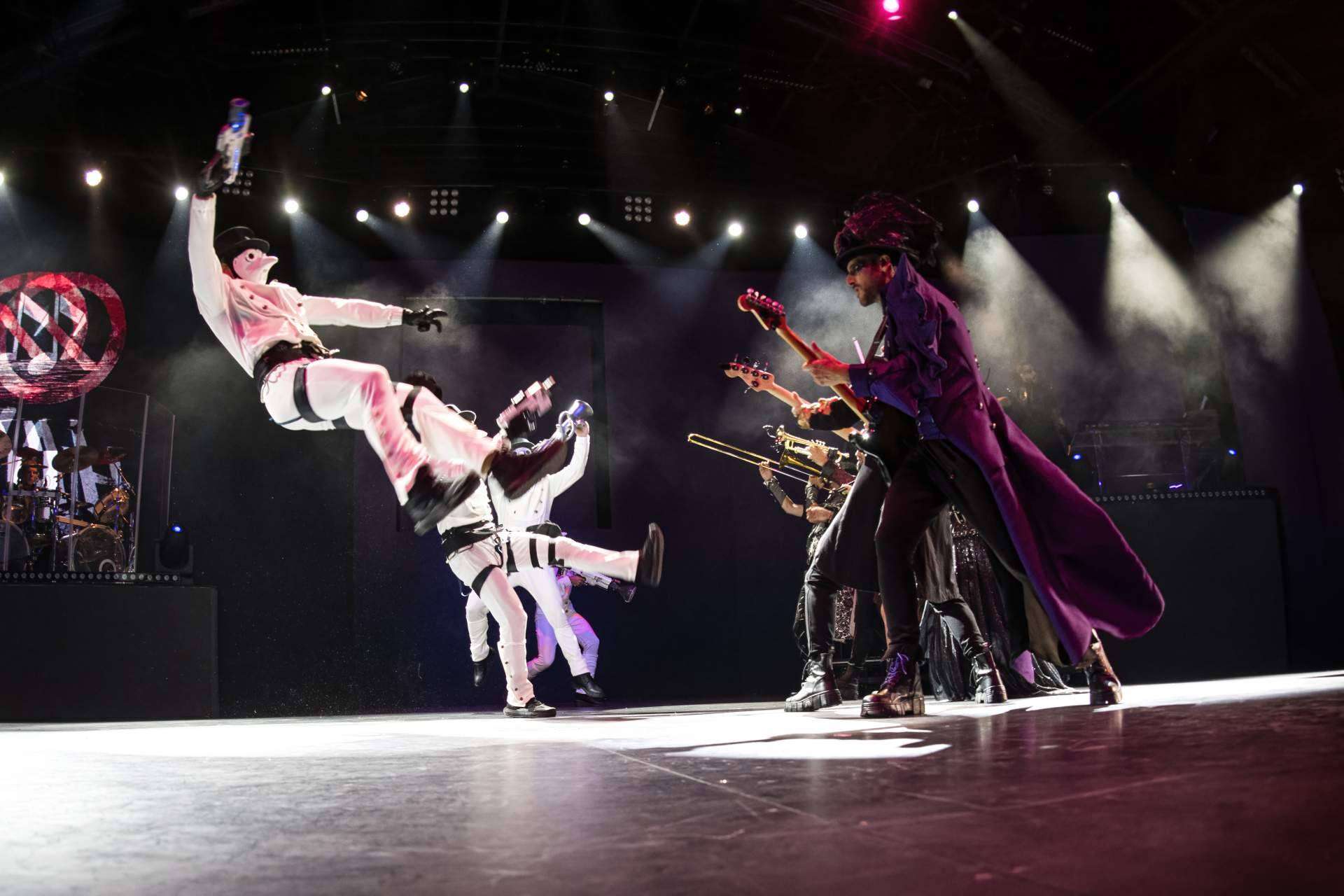 Acto 2 en WAH Theatre: El corazón del evento. Más de 80 artistas dan vida a una historia distópica donde la música es resistencia. Desde clásicos del rock hasta baladas icónicas, cada tema revive con una puesta en escena deslumbrante.