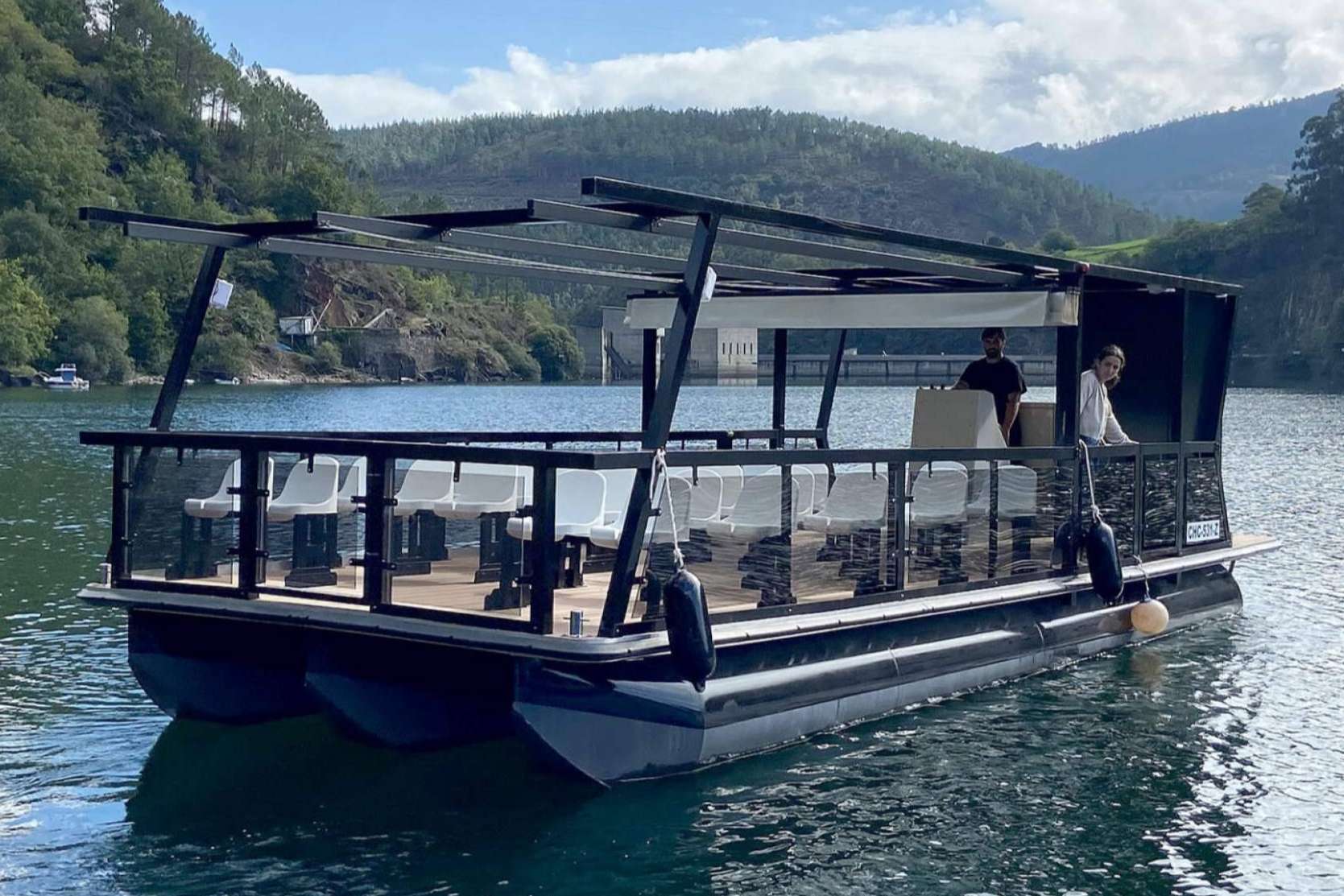 La embarcación entregada —una pontona de 10 metros de eslora por 4 metros de manga, construida en aluminio naval— ha sido diseñada y homologada bajo normativa CE. El número máximo de plazas estará determinado por la normativa aplicable en el país donde se opere, y podrá variar en función de si la embarcación se destina a navegación en aguas interiores (ríos o lagos) o en mar abierto.