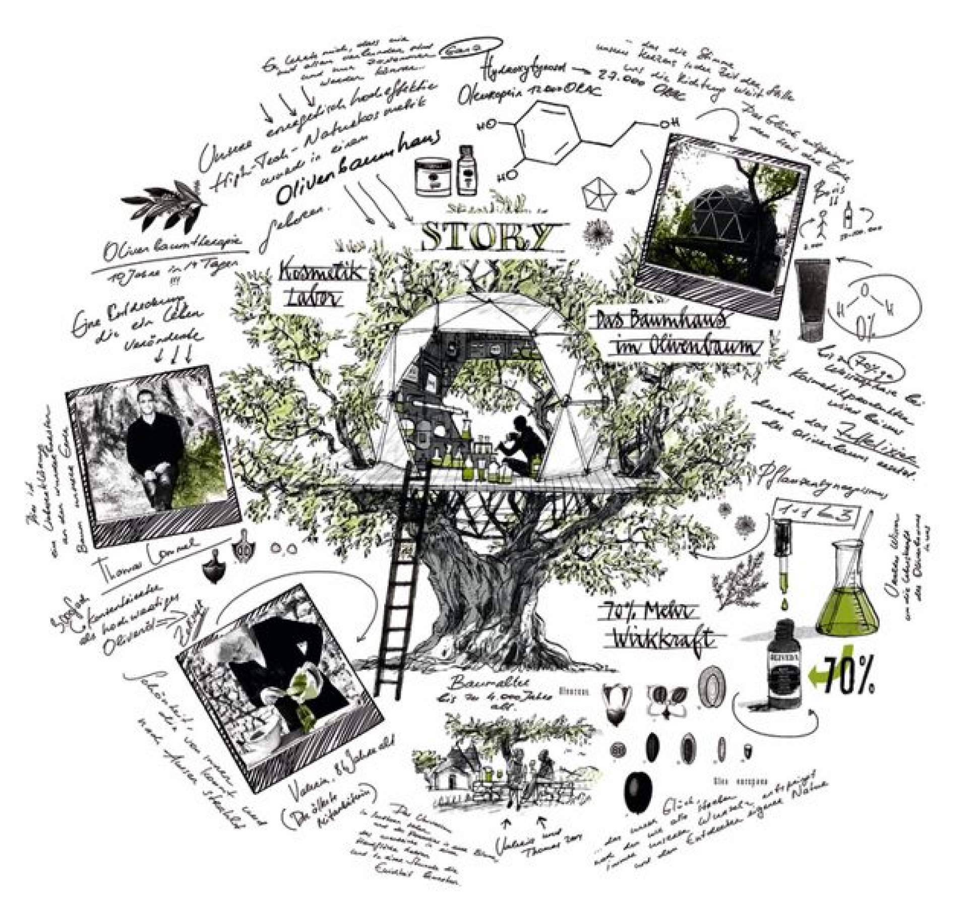 El comienzo de esta historia lo cuenta una casa en un árbol, situada entre estos magníficos olivos de montaña. Allí fue donde Thomas Lommel, fundador de Olive Tree People, desarrolló la marca de cosmética natural holística Oliveda. Sus productos altamente eficaces se basan en el poder de los olivos silvestres: en lugar del 95% de agua destilada y aceites refinados y sin vida que contienen los cosméticos convencionales, los productos Oliveda incluyen un elixir altamente antioxidante extraído de las hojas de olivos de 200 años y el aceite vital de las aceitunas Arbequina, que crecen sin ser molestadas hasta que se recogen a mano. Mucho antes de que se hiciera viral a nivel internacional, Thomas Lommel marcó tendencia con Waterless Beauty
